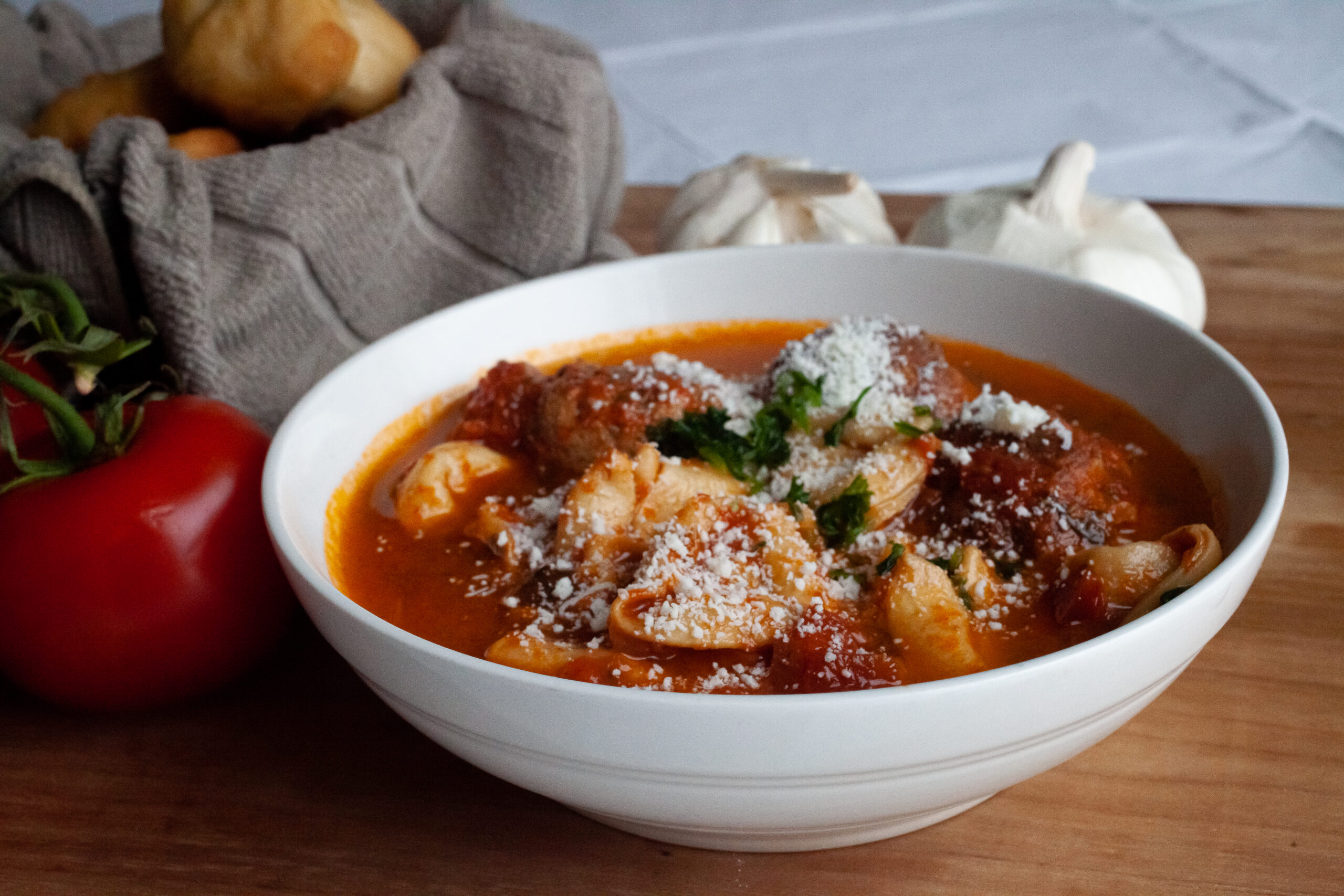 Handcrafted Meatballs with locally sourced beef, pork, veal and Cheese Tortellini, Garlic, Onion, Basil, simmered in Diced Tomato Broth.